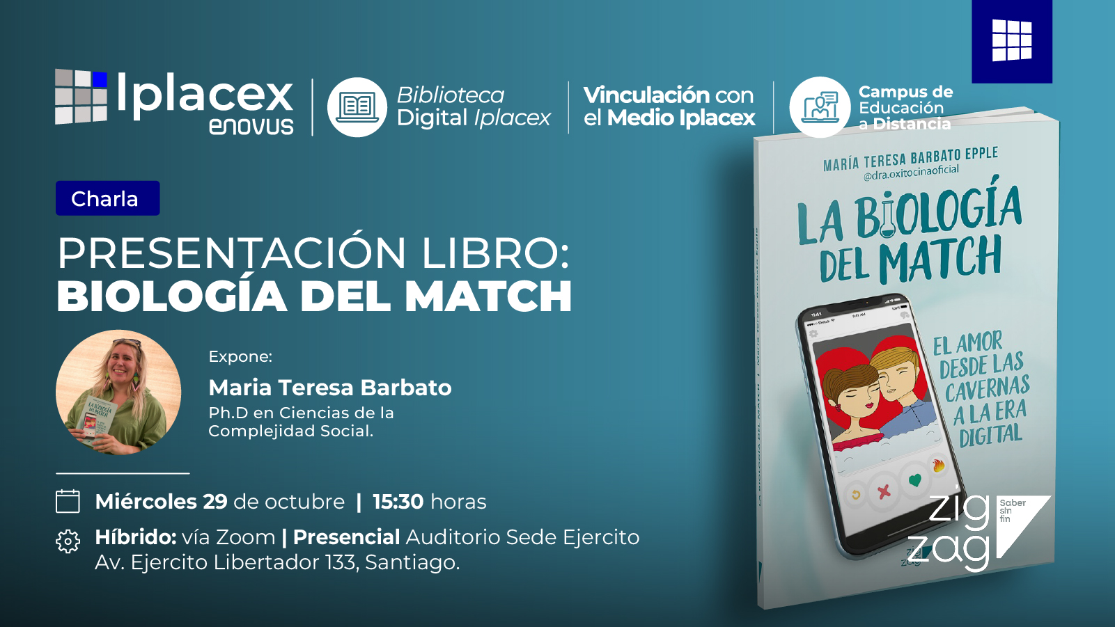 Este mi茅rcoles 29 de octubre, a las 15:30 hrs, la comunidad acad茅mica de Iplacex tendr谩 la oportunidad de participar en la presentaci贸n del libro 芦La Biolog铆a del Match: El Amor Desde Las Cavernas a la Era Digital禄, obra de la investigadora Mar铆a Teresa Barbato Epple, Ph.D. en Ciencias de la Complejidad Social.